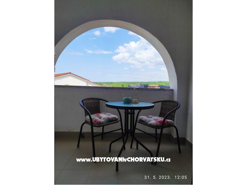 "APP4" - Apartament na drugim piętrze dla maks. 6 osób z wyposażoną kuchnią i jadalnią, łazienką z prysznicem, sypialnią z łóżkiem piętrowym dla 2, salonem oraz drugą sypialnią z łóżkiem podwójnym i dodatkowym łóżkiem. Taras od strony północnej, w cieniu.